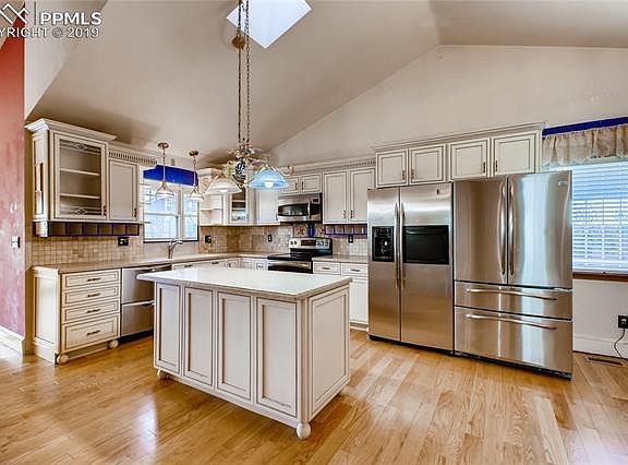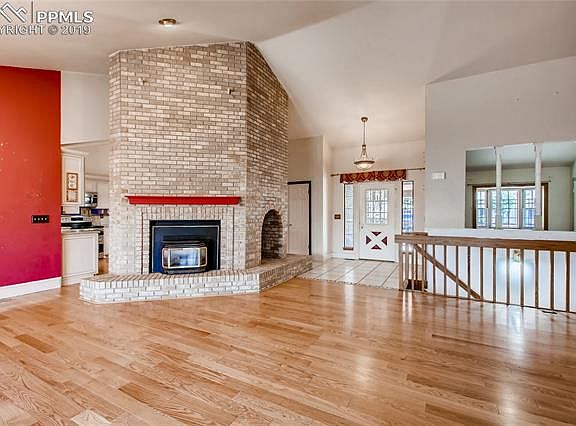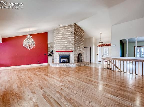 Great opportunity! Main level w/ spacious living and dining room. Wood flooring, vaulted ceilings, gas fireplace w/ floor to ceiling brick surround. Kitchen boasts corian counter tops, island, SS and tons of storage. Main level office or possibly formal dining, master w/ attached full bath w/double vanities and spacious walk in closet. Additional bedroom w/ walk in. Basement features large family room, 3/4 bath, bedroom w/ 2 closets, 2 add'l rooms for play area, fitness, crafts, office, the possibilities are endless. This is a one owner home and features great bones and a wonderful opportunity to make it your own. The home backs to a creek therefore no direct rear neighbors. Located in a great neighborhood close to schools, shopping and entertainment. Easy access to the Powers corridor as well as Peterson AFB and an easy commute to Schriever AFB.