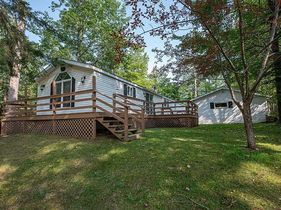 THIS is your AFFORDABLE vacation getaway! Who needs a property on the chain when THIS SUPER CUTE mobile is just ONE MINUTE from the chain o lakes road boat landing!(I know, I clocked it myself!!). Sellers have done ALL of the work for you in making this adorable 3bd/2ba mobile just perfect for you & yours to hit the snowmobile trail or hit the water on the chain! New kitchen cabinets/countertops, light fixtures, all new bathrooms, paint, flooring, doors, water heater- all within the past 3 years. Central air/natural gas. Wrap around deck and large 2–stall garage complete this package. Walk or ride to Wild Eagle Lodge, Sweetwaters, Pirates Hideaway or Kickback from this convenient location. This is truly an affordable place to getaway or live year-round. NO VRBO, AirBNB, subletting, or month-to-month.