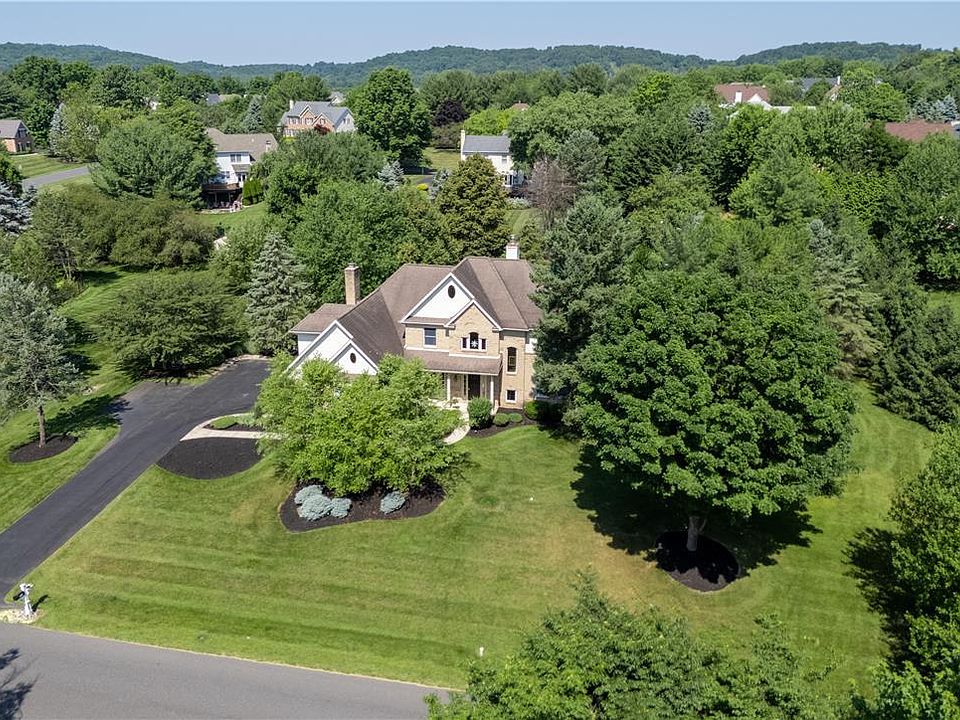Make this fabulous MAJESTIC OVERLOOK home yours! An impressive home boasting a 4,448 square foot floor plan on a nearly 1 ACRE lot with mature trees and professional landscaping. Upon entry you’ll immediately love the gorgeous HARDWOOD FLOORS throughout the main level. The 2-STORY GREAT ROOM is open and airy, offering beautiful backyard views through a massive wall of windows. Formal dining seamlessly flows to the great room with a GAS FIREPLACE, wet bar, built-in cabinets & WINE FRIDGE. A well appointed kitchen has a large CENTER ISLAND as the focal point, offering seating and tons of prep space with granite countertops, Thermador & GE Monogram appliances plus custom wood cabinets. Combined with an eat-in breakfast nook and sitting area with WOOD-BURNING, stone front FIREPLACE this kitchen is a warm and cozy gathering place. The FIRST-FLOOR PRIMARY bedroom and spa-like ensuite bath has full glass shower, double vessel sink vanity plus large linen closet with glass door. The second floor offers 4 additional bedrooms, 2 full baths plus large 22 X 18 DEN plus 2nd OFFICE. Finished Lower Level with NEW CARPET offers a private office, theater and full bath. Entertain friends and family around the IN-GROUND SALTWATER POOL with patio space and SCREENED IN PATIO for multi-season use. Public water & sewer plus GAS HEAT. Saucon Valley Country Club is nearby. Close proximity to major commuter routes and hospital campuses. Saucon Valley School District.