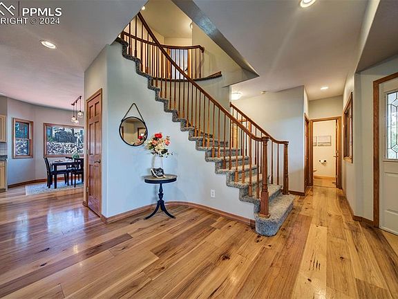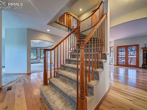 Welcome to your dream home! This beautifully updated 6-bed, 4-bath, 2-story, 4800 SqFt custom home with a 3-car garage sits on .62 acres and offers inspiring panoramic views. Designed to blend with the captivating Colorado Blue Sky and landscape, enjoy picture-perfect sunsets and views of Pine Creek Golf Course, the Front Range, and Cheyenne Mountain. Fresh paint inside and out, new carpet, and three renovated bathrooms provide modern comfort. The interior boasts a wood entry, curved staircase, and an inviting eat-in kitchen with breakfast bar, stainless steel appliances, wood and tile floors. A walk-out living room with a fireplace, formal dining, and formal living room complete the main level. Upstairs, a grand primary suite features a 5-piece bath with a freestanding soaking tub, and three more bedrooms share a new full bath. A versatile 6th bedroom offers endless possibilities. The finished basement adds an extra bedroom, a sitting area, and an attached 3/4 bath, with a spacious rec/family room featuring a fireplace and rich wood-paneled walls. Solar panels, an electric vehicle charging port, and a hot tub on over half an acre enhance eco-conscious living. Pine Creek Filing #1 offers a vibrant community with easy access to shopping, the Air Force Academy, and I-25. This isn't just a home; it's a lifestyle. Don't miss your opportunity—schedule your showing today and start living your Colorado dream!