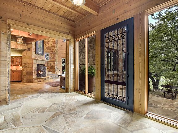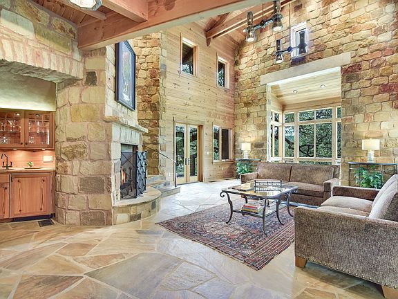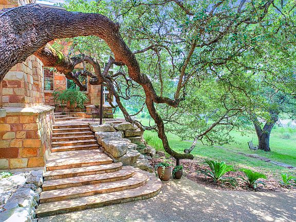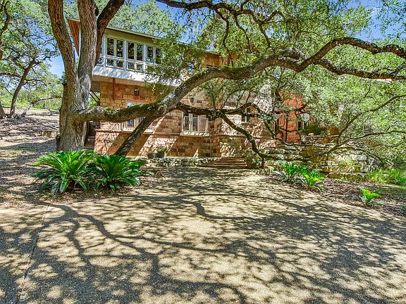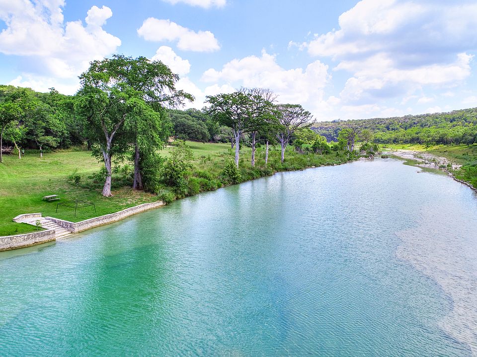 Spectacular architecture in an incomparable waterfront setting: This unique property boasts one-of-a-kind details inside and out. Perched in a grove of ancient oaks along 440 feet of Blanco River frontage, this over 6500 square-foot home is made for entertaining and enjoying the natural beauty of the Texas Hill Country. This home was designed to nestle into the banks of the river and to take full advantage of the views. Two expansive outdoor decks provide plenty of space to enjoy the outdoors from cooking to dining to relaxing. Inside, rooms look out onto the water and the twisty trunks and greenery of the trees, giving the feeling of living in a treehouse. Reclaimed (and now extinct) longleaf pine was salvaged from a schoolhouse in nearby Gonzales, giving the home a sense of warmth and history. The handmade light fixtures are reminiscent of the prairie style of architecture. For ceilings and massive beams reinforce the Texas "lodge"-type style. Other features include natural stone floors, stainless countertops, and custom-made cabinetry. Never was living in an architectural masterpiece so comfortable and welcoming. A massive barn includes a spacious guest apartment perfect for a caretaker as well as room for a very large RV. Workshop and additional storage is also abundant. This property represents an oasis of privacy while still boasting convenient access to Austin, San Marcos and San Antonio via Interstate 35. The convenience and charm of the artist and musician enclave of Wimberley is a short, scenic drive away.
