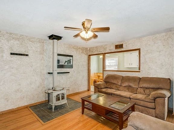 Sweet 2 bed 1 bath home. Covered front porch. Living Room has wood floors, wood burning fireplace. 2 bedrooms 1 bath. Open Kitchen with Banquette, stays with home. Main Floor Laundry/Mud Room. Nice fenced backyard, storage sheds. Vinyl siding, 3 year old Heat/Air, and Hot Water Heater. Mature Trees. Great 1st home.