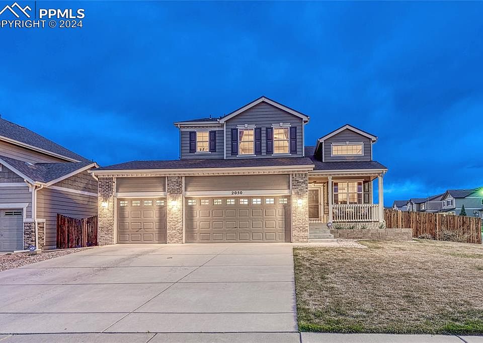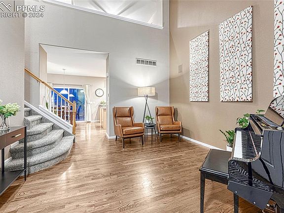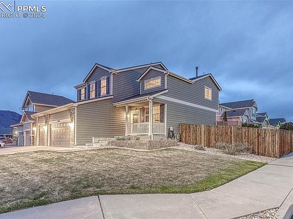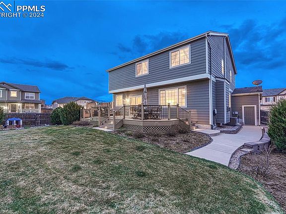 This beautiful 5 BD|4BA|3CAR home in Lewis-Palmer School District with convenient access to I-25 features a professionally landscaped corner lot, fantastic outdoor living space, central A/C and a fully fenced backyard. Welcome family and friends from the covered front porch to the living room featuring a vaulted ceiling and hardwood floors. Surround sound is featured here as well as in the kitchen and great room, each individually controlled. Walk through to the eat-in kitchen with 9 ft ceiling, hardwood floors, pantry, island and free-standing double oven with gas range. Refrigerator included! Walk-out to the expansive composite deck with built-in bench, gas line and backyard access to areas for playing and lounging and even a fully irrigated raised planter bed. Back inside, the great room also boasts a 9 ft ceiling, gas fireplace and large window to the beautifully landscaped backyard. Adjacent is a main level bedroom (or home office?) with adjoining ¾ bath. Upstairs is the primary bedroom with breathtaking views of the Front Range, two closets, black-out shades and a ceiling fan. Adjoining is the 5-piece bath with double vanity, walk-in shower and jetted tub. The loft and two additional bedrooms also feature ceiling fans. Note the convenient upstairs laundry space.The finished basement provides large open areas to use however fits your needs: a gaming table, home gym or media area perhaps? Here you will also find the 5th bedroom with walk-in closet, ceiling fan and adjoining a full bath and handy storage. Not far is the Santa Fe Trail and opportunities for walking, running and other outdoor activities. You might even make your way into downtown Monument for dinner, ice cream and local shopping.