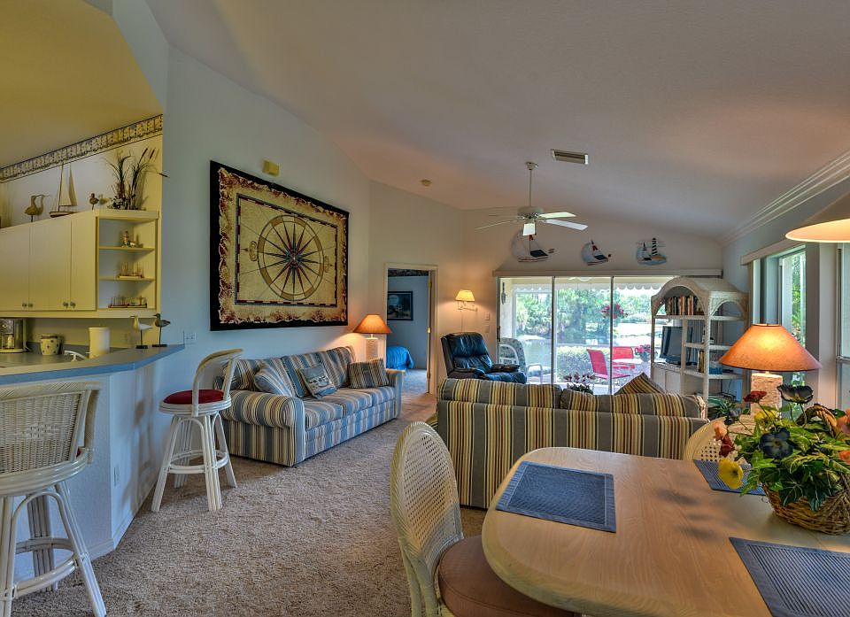 This beautifully turnkey furnished two bedroom, two bath condo has a private lanai overlooking the Burnt Store Marina golf course. Immaculately maintained, this condo sleeps six with a Queen bed in the master suite, 2 twins in the second bedroom, and a Queen size sleeper sofa in the living room. There is a second full bath. Recently added upgraded carpet in bedrooms and greatroom, washer, HVAC system, front and & rear screen-in lanai with tile, hurricane shutters, metal roof. It is just minutes by boat to Cayo Costa, Cabbage Key, Charlotte Harbor, Useppa Island and Boca Grande. Just bring your swimsuit, sunscreen and fishing pole! Burnt Store Marina is a gated resort community with a 500 plus slip marina, a boat launch, a 27 hole golf course, tennis courts and an athletic club. There are two restaurants at Burnt Store Marina, Cass Cay's Restaurant which overlooks the marina and the Linkside Cafe which is a short walk from the condo down the cart path on the golf course. Enjoy boating and fishing with local fishing guides or bring your kayak which you can store in the garage. Contact owners: 239-313-3684 kinglc57@gmail.com