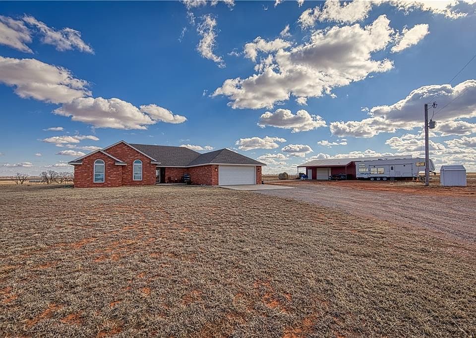 Almost 4 acres of rural acreage just minutes away from Elk city. This beautiful brick home has an open concept main living area, eat-in bar and covered patio right off the dining area perfect for entertaining and family cook outs. The bedrooms have high ceilings and stained concrete floors. The master en-suite boasts a large walk-in closet, jetted tub and separate tile shower. The 30 x 60 metal barn has both an automatic 7' door and 11' door.