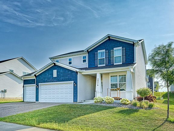 Welcome home to this gorgeous extra specious custom built two-story home in the desired Lakeville area. As you walk in the main entrance, you are welcomed by ample foyer space To your right, you'll see a sunny office room with plenty of space. Followed by a secured door to the unfinished basement, ready to be turned into your dream entertainment cozy place with extra storage room and egress windows. Main level offers a large mudroom, a gourmet kitchen, breakfast bar area with all stainless appliances and a window right above the double sink to keep an eye on the kids in the green backyard. Informal dining and the extended living room w a cozy fireplace