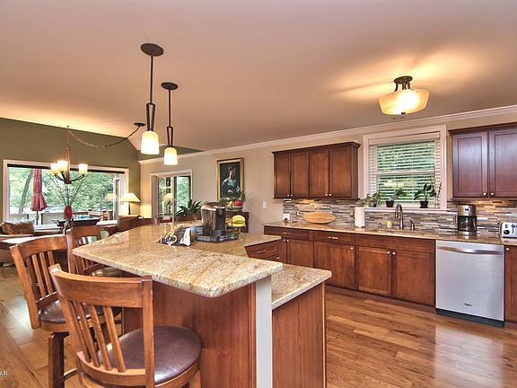 This one of a kind open floor plan concept lakefront home is in a class of its own. The property features 81' of lakefront frontage, is meticulously landscaped, has a lakeside stoned patio, a boat launch and dock. It has a detached 2 car garage with stairs to the second level storage area, a paved driveway and Trex decking. This 5 bedroom, 3 1/2 bath home has solid hickory floors, propane forced air heat/air conditioning with backup electric baseboard heat, whole house GENERAC generator and a RINNAI on demand hot water heater. The screened in porch has Sunsetter electric weatherproof shades with remote. Newer Anderson windows face the lake with a lifetime guarantee. The kitchen has a propane fueled range and an electric oven. On the lower level there is a bar, gaming area, tv area and enclosed patio which faces the lake. All of this on power boating Roamingwood lake in The Hideout, a 4 season recreation community with pools, beaches, a clubhouse, golf course, ski hill and more.