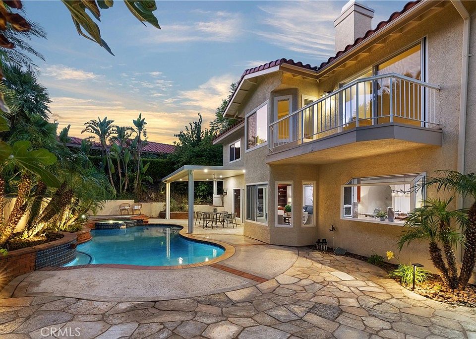 This exquisitely reimagined Estate II District residence, masterfully crafted by S&S Homes, graces the prestigious East Lake Village enclave in Yorba Linda. Encompassing 4 bedrooms, 3 bathrooms, and a grand bonus room (configurable as a 5th bedroom), this 3,850 sq ft sanctuary seamlessly marries opulent luxury with timeless sophistication. Enter to discover soaring cathedral ceilings, gleaming travertine floors, and a formal living room adorned with a bespoke fireplace and expansive windows that bathe the space in natural light. The adjacent dining salon, accented by intricate crown molding and a climate-controlled wine cellar, sets an unrivaled stage for lavish gatherings. The epicurean kitchen, a culinary masterpiece, boasts lustrous granite countertops, custom artisan cabinetry, a generous center island, and a professional-grade WOLF 6-burner range with a dedicated pot filler. This culinary haven flows effortlessly into a refined family room, featuring a stately fireplace and panoramic sliding glass doors that open to a serene backyard retreat. A luxurious downstairs bedroom, appointed with polished marble floors and direct outdoor access, serves as an ideal guest suite or private office, complemented by a full bathroom and an elegant laundry suite. Ascend to the palatial primary suite, a haven of tranquility with its own fireplace, expansive walk-in closet, new floor-to-ceiling windows, and private balcony overlooking verdant vistas. The spa-inspired ensuite bath offers dual vanities, a frameless glass shower, & abundant custom storage. Two additional upstairs bedrooms, one with dramatic vaulted ceilings, share a meticulously designed full bathroom with granite finishes and travertine accents. The expansive bonus room, crowned with vaulted ceilings, a sophisticated wet bar, and the home’s fourth fireplace, offers endless possibilities for entertaining. The secluded backyard oasis beckons with a bespoke Alumawood pergola equipped with a ceiling fan, a shimmering pool and spa, meticulously curated landscaping, a flourishing lemon tree, and ample space for alfresco entertaining. Elevated by recent enhancements, including a new roof and state-of-the-art electrical panel, this residence epitomizes modern luxury. Nestled within East Lake Village, residents enjoy exclusive access to resort-caliber amenities, including sparkling pools, a grand clubhouse, tennis courts, state-of-the-art fitness center, serene lake trails, & more—all within the acclaimed PYLUSD.