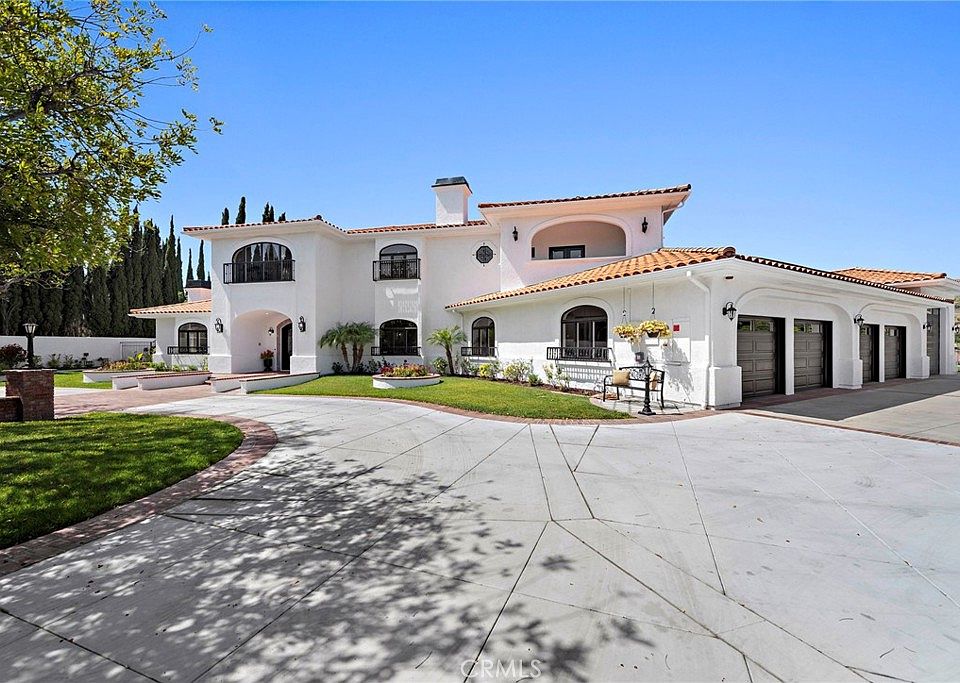 Nestled atop the serene bluff overlooking the hills of Orange County, 20525 Cassia Lane is a rare gem.This elegant gated estate sits on a prime parcel of nearly two acres, offering the ultimate in luxury. This estate has been one family owned and in 2024 saw the complete remodeled of all interior and exterior spaces- the result is a beautiful designed home situated on an obscure cul-de-sac spanning nearly 7,000 square feet of elegant living. The formal foyer is grand with a sweeping iron staircase & voluminous ceiling which sets the tone for this spectacular home. The living room features a stunning marble fireplace surround with walls of windows providing an abundance of natural light and views of the gardens. The formal dining room can accommodate entertainment on a grand scale. Designer inspired chef's kitchen offers the finest amenities and finishes of quartzite counters, marble accents and stainless appliances. Offering space for luxury living and grand scale entertaining the two-tiered great room will surely be a favorite. The upper level offers an intimate setting, accented with stacked stone fireplace and custom built-ins. The lower level offers the option for a game room, dance floor or home theater, with a fully equipped second kitchen and bar seating. A testament to thoughtful design, this estate features six spacious bedrooms, an expansive home office and eight well-appointed bathrooms. The main floor home office is conveniently situated off the formal entry with walls of custom-built bookcases, a fireplace and rich wood flooring. Two ensuite bedrooms are on the first floor which are perfect for a main floor primary, guests or multi-generational living. The upper-level primary suite is spectacular with a stunning fireplace, private dressing room, and the most luxurious marble bath with dual vanities, freestanding soaking tub, grand shower and two walk-in closets. Three additional ensuite bedrooms with balconies complete the upper level. The estate's outdoor amenities are equally impressive with stunning grounds featuring a sparkling swimming pool and spa, pool house, putting green, multiple patios for entertaining. Four-car oversized garage, extra large driveway to accommodate all the vehicles with additional RV/boat enclosure w/hookups, and designed to provide ultimate outdoor living experiences. This exceptional estate presents a unique opportunity to own a one-of-a-kind piece of paradise in Yorba Linda.