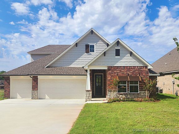 The London at Frazier Meadows is located within the Bixby school district which is known for its place among the top 10 school districts in Oklahoma. Featuring the Cool Breeze design package, this two story home has a 3-car garage, covered patio entry and two bonus rooms! The entry stands out with its elegant lighting fixtures and wood beams adorning the ceiling. The open living room boasts beautiful woodwork and built- in shelves surrounding the gas fireplace. With wood floors and large windows the kitchen has a large island and pull-out trash for convenience. Nestled in the far corner of the home, the primary suite provides a luxurious escape with a lavish bath featuring a 6ft tub and walk-in shower with Schluter waterproofing. Adjacent is a versatile flex room with sliding barn doors, ideal for a study, hobby space, or home gym. The two bedrooms downstairs have ample space and share a Jack and Jill bath. Upstairs, a sizable flex room can serve as a fourth bedroom with a full bath and closet, or as a playroom or home office. Outside, a covered back porch off the living room, complete with an outdoor fireplace, provides an inviting retreat. Situated on a 0.2-acre lot facing southeast, additional amenities include a full sprinkler system, tankless water heater, healthy air filtration system, and smart system. The Frazier Meadows neighborhood enriches family living with its array of amenities, including a swimming pool, pickleball courts, playground, walking trails, and fishing pond. Self Tour is available for this home, contact us for door code.