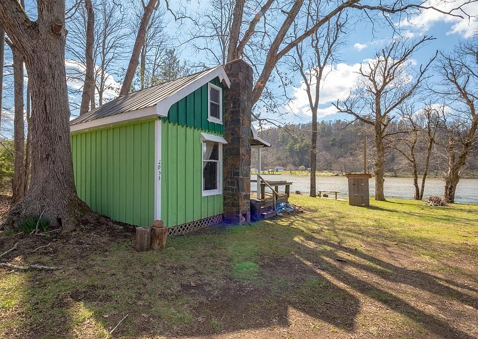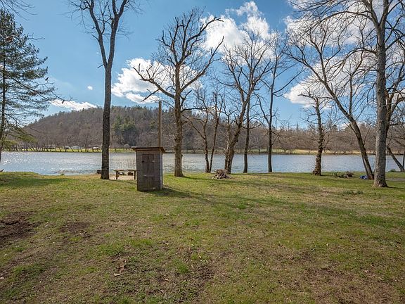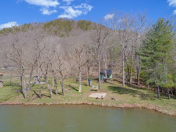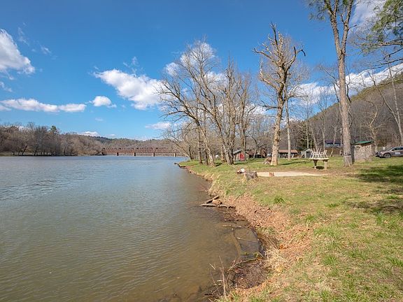 This is a truly unique property! It has the original tiny house concept with a sleeping loft and the open area below with a flue for a small wood stove (the one in the photo does not stay.) A native stone chimney and an open deck around a large tree makes this place extra special. The land is rolling with the house on the back knoll. A small branch on the left side and New River frontage across from the New River Trail. The land has a well and electric in place (these items will be completed by the seller in the future.) Easy access to the waterfront, good fishing and views. Water depth is about 4+ feet per the owner. There is also a concrete pad for the picnic table to sit on near the water. Come and make this a summer playground.