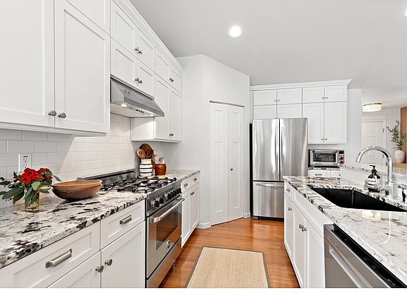 This exquisite ranch-style home boasts high-end finishes and designer decor. Step inside to admire the custom white oak built-in shelf in the foyer and a neutral paint palette that enhances the home's charm. Gleaming hardwood floors, soaring ceilings, and a fireplace grace the main lvl. French doors with a retractable screen lead to the deck and a fenced yard with an irrigation system. The primary suite features a custom walk-in closet w/ crown molding and a private bath w/ a seamless shower. With 4 BRs/3 baths, and a finished LL, this home doubles your living space. The kitchen is a chef’s dream, updated with custom white cabinetry, granite countertops, a tile backsplash, and a stainless Bertazzoni gas range & hood. The finished lower level offers a rec room, exercise room, dining area, BR with amazing walk-in closet and a full bath. New Arch roof 2024. Enjoy the subdivision's club pool and clubhouse amenities. Don't miss your chance to own the most sophisticated home in the area!