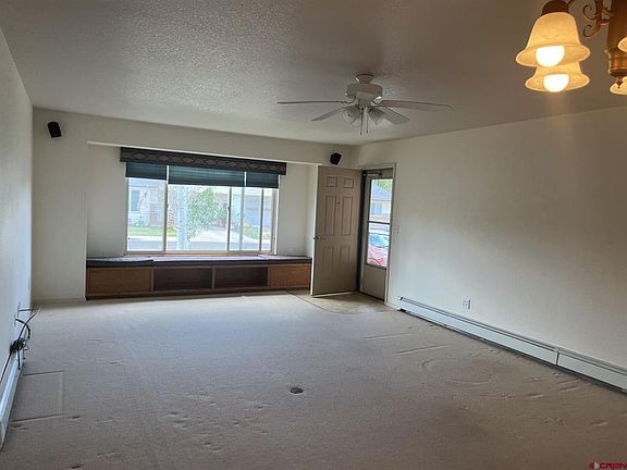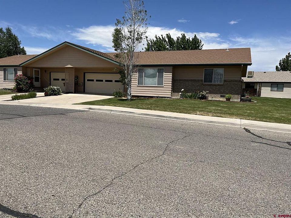 When you walk into this home, one of the first things you will notice is how well it has been cared for, and that it is spit shine clean! The kitchen is bright with natural light, lots of counter space and a pantry. The kitchen can be entered from the TWO car garage which is so convenient for unloading groceries. In the garage there is built in shelving on the walls, plus an attached double cabinet with shelving as well. There is also a large wet sink in the garage for any cleanup you don't want to traipse through the house- be thinking paint brushes or muddy hands from gardening! At one end of the patio, the former owner created an 11'8" X 9'6" room with a window, carpet, overhead lighting, and electric baseboard heat, which she used as a craft room. There is still plenty of room on that patio to enjoy coffee in the morning, or a beverage of your choice in the evening, as you look at the beautiful landscaping that someone else is taking care of! The primary bedroom is large, has two double closets and a 3/4 bath. The second bedroom is also a good size, and there are ceiling fans in the primary bedroom, in the dining/living room area, plus an evaporative cooler. Additional storage is provided by a linen closet and another closet, both in the hallway between the bedrooms. There is a nearly new stackable washer and dryer combo in the laundry closet in the hallway. The living /dining room combo is spacious with built in window seats. The outside is a combination of brick and siding, there are vinyl windows, and this is a corner lot. There is so much privacy provided by some very large, beautiful spruces and other plantings which are maintained by the HOA. This home is comfortable and clean with a great floorplan!
