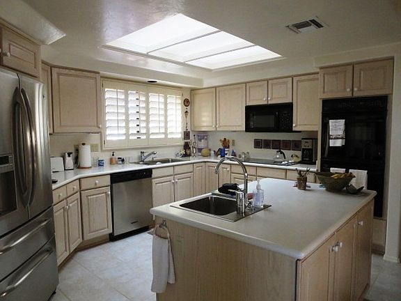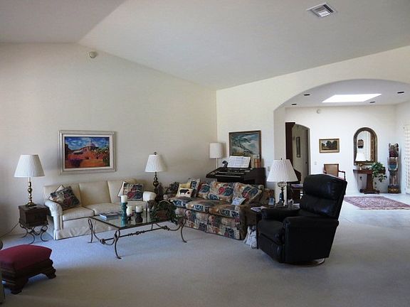 The red territorial block brings out the flavor of the desert southwest and leads you through a front courtyard into a large entry foyer with an arched passageway to luxurious living. This unique floor plan splits two sliding doors with a cozy fireplace and has vaulted ceilings for a spacious fresh feeling. An oversized skylight brightens up the kitchen cooking island and shows off its beautiful cabinetry and corian countertops. Enjoy a quick snack in the breakfast nook with sliding patio doors leading to the east covered patio. The oversized master bedroom suite has an expansive master bath with jetted tub and separate shower. Two large guest bedrooms await your guests. Tucked away off the garage is a special bonus room which can be used for exercise, crafts or an office.