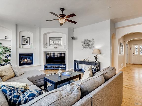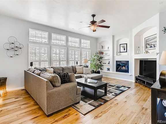 Views of the majestic Rocky Mountains and native vegetation as far as the eye can see. This 5-bedroom/4-bath home sits on a cul-de-sac receding the beautiful foothills of The Meadows Neighborhood. Stacked rock adorns a portion of the homes exterior, including a double-sideload garage; a single-car garage lies nearest a split-rail fence lining the perimeter of a landscaped yard with a stamped concreate back patio and gas firepit perfect for cozy nights observing visiting wildlife. Indoors, natural light gleams throughout as it reflects off hickory floors and arched walk-ways dotting the main-floor. Near the front entrance is a convenient home office with French doors and dining room framed by tray ceilings. A Butlers pantry cascades from the dining room to the kitchen with access to a walk-in pantry. The eat-in kitchen takes shape with stainless-steel Whirlpool appliances, 5-burner gas stove, center island, granite countertops and a built-in desk. The kitchen opens onto an inviting living room accented by a gas fireplace and arched built-in shelves. The second-floor is occupied by another built-in desk, linen closet and four bedrooms three with walk-in closets. The master suite boasts a gas fireplace and 5-piece ensuite with quartz countertops, ceramic-tile floors/shower and soaker tub. An additional second-floor bathroom has ceramic-tile floor and shower; plus, a double-vanity with quartz countertop. In the basement, a family/rec room is appropriately outfitted with a wet bar; as well as an additional bathroom and bedroom with egress window and closet built-ins. The master planned community is 30 minutes from Denver and Colorado Springs. Neighborhood residents enjoy access to two swimming pools, miles of nature trails and more.
