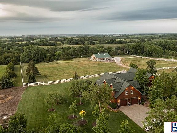 Built by Kuhlman Construction for their personal home, this house was featured in Country's Best Log Homes magazine, the Omaha World Herald and the Lincoln Journal Star. Located 12 miles West of Lincoln the 15 acre property consists of a house and three out buildings. The Log home is 4,850 square feet on first and second floor. Back deck has 1400 sq ft and view of the Lincoln skyline. Main floor consists of kitchen with pantry, great room, laundry, mud room and primary bedroom with full bath, two walk-in closets. The second floor has an L shaped loft looking down into the great room, 3 bedrooms, 2 bathrooms, 2 office areas and a craft room. Three sets of stairs connect the main floor to the second floor. The basement is 780 sq. ft. and used for gym, storage and mechanicals. Other buildings include a 4 stall horse barn, heated shop and a guest house. There is also an outdoor arena.