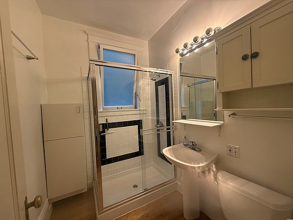 Expansive windowOld-growth redwood moldingsLarge windowsCustom solid wood cabinetsBuilt-in cabinetGlass-enclosed showerUpdated bathroom