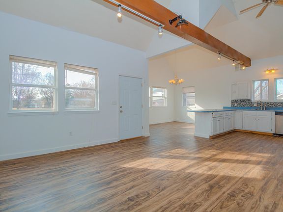 This lovely home, situated on a double lot, provides plenty of space from neighbors and ample spece to plant a garden, let the kids or pets run free, or just enjoy the sunshine! The inside begins just off the front porch and boasts an open floorplan where the chef has a sizable kitchen with large expanses of countertop and plenty of cabinets to store all of the cooking gadgets. The kitchen is open to the diningroom on one side and the large livingroom on the other. Toward the back of the home are two bedrooms and a full, large sized bathroom. The main floor is rounded out at the back door with a mudroom space that exits to the back porch. At the base of the stairs is the laundry area and then up you go to the loft which holds bedroom number three and an attached half bath. Come take