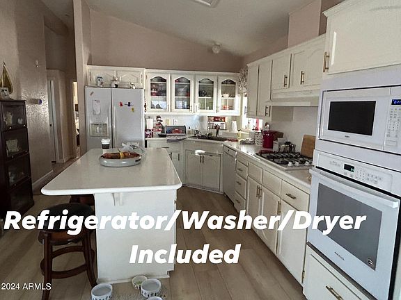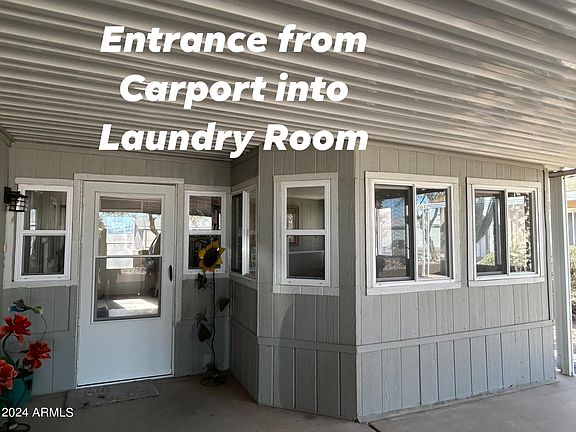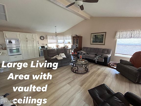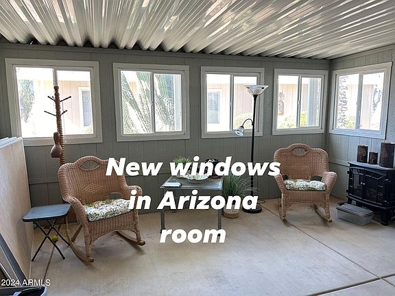 Located in a gated active adult community, this updated partially furnished home has 2 large bedrooms & 2 full bathrooms. Primary bathroom has double sinks & walk in shower. Second bath has tub/shower combo. Laundry room has a ton of storage and washer & dryer included. Kitchen has island, lots of cabinets & refrigerator is included. NEW upgraded pet friendly flooring in living room/kitchen and dining area. No carpet. Vaulted ceilings making the home feel even larger. Arizona Room has NEW windows. Appliances new within last 4 years. Shed for even more storage. Owner had block wall built for privacy & security for pets in large backyard -This home is in the Pet Section which doesn't come available often. Home has a TILE roof - not shingles like the others. Carport for two cars.