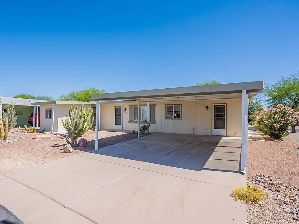 Move-in ready Home at Fairways 55+ Community with direct access to Dave White Golf Course! This 2-bed, 2-bath home features a remodeled kitchen with laminate flooring, new counters, sink, reverse osmosis, and updated appliances. Dual gas/electric hookups, ceiling fans throughout, leveled foundation, and walk-in closets in both bedrooms. 2023 metal roof (warranty), 2024 exterior paint, updated drip system. Enjoy the Arizona room, landscaped yard with fruit trees, 2-car carport, and shed for storage or a workspace. Fairways offers a private rec center featuring a putting green, year-round climate-controlled swimming pool & spa, exercise facility, & daily planned activities, PLUS access to Sundance amenities like 2 Golf Driving Nets,12 pickleball courts, bocce ball and more!