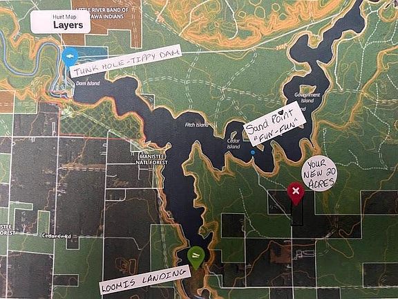 PROPERTY LIKE THIS ONLY COMES AROUND ONCE IN A LIFE TIME...20 beautiful, fully wooded acres, with a beautiful pine ridge and ORV trails/road through out your 20 acres. You, your family and friends can each have their own camp site & your all set up for deer hunting with his or her own blind. YOUR 20 ACRES is just a few minute car or ORV ride/10 minute walk to the BACK WATERS OF THE TIPPY DAM! There my friends is ''SAND POINT'' which is an approx. 100' sand bar were you, your friends and family can sit back and enjoy the gorgeous back waters. Swim, boat, fish, float and or bring a beach chair and just relax!!! YOUR 20 ACRES is adjacent to 1000's of acres of Manistee National Forest, electric at the road, County maintained road year round. Now this my friends is YOUR PURE MICHIGAN! Tippy Dam pond is approx. 28 miles in length. It is so peaceful with no homes at all on back waters...truly unique, TUNK HOLE is a 15 minute drive. Pine river access is 1.8 miles away, 8.3 miles from The Dublin Store, 26.3 miles away from Lake Michigan Fishing & beaches and 30 miles from the Little River Casino. Not to mention Big Manistee River, Little Manistee River and Manistee Lake...NEVER BORING IN MANISTEE MICHIGAN
