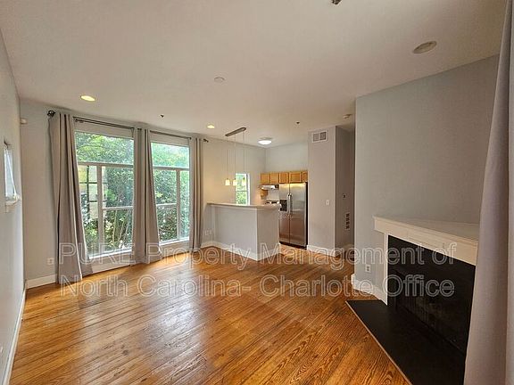 Situated in the Dilworth/Atherton Heights community, this end-unit 2 bed 2 bath, 1,161 sq. ft. townhome is just what you're looking for! With four floors of space, the first floor (lower level) offers a large bedroom, full bath and private patio access. Second floor (main level) is an open floor plan with kitchen, den w/fireplace and is accented with floor-to-ceiling windows, which include blinds and window treatments throughout the home. The third floor (upper) hosts the primary bedroom w/two closets and private bath. Fourth floor tops off the townhome, offering storage and a large patio with amazing views of the Charlotte skyline. Washer and dryer are included for resident use! Two parking spaces available. Please note this home is unfurnished. Virtual staging has been implemented to enhance visual placement of furniture. Pets are conditional based on pet screening results and will require a non-refundable pet fee and monthly pet rent. Limit one small pet up to 20 lbs. Close walk to Southend restaurants, bars, shopping and a East/West light rail station. Security deposit will be the minimum of one, but not more than two months rent. We would love to tell you more about this home. Optional Resident Benefit Package: This package is available for residents and can include credit building, a tenant liability insurance policy, HVAC filter delivery, ID protection, pest control and one-time late fee forgiveness. Amenities: ceiling fans, range/oven electric, dishwasher, refrigerator, fireplace, floor-to-ceiling windows, private patio, skyline view, hardwood floors, vinyl, storage, breakfast bar, washer/dryer included, blinds, curtains