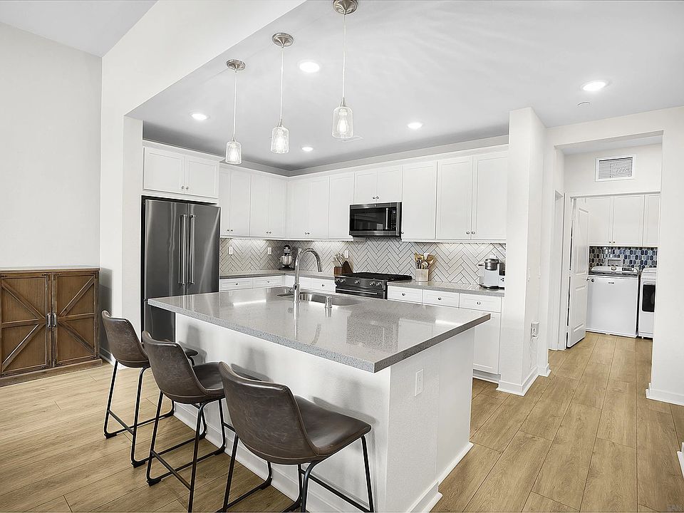 This gorgeous home is an elevator penthouse! Third floor showcases generous open-concept living, kitchen (KitchenAid appliances) & dining spaces that open to spacious covered balcony. Two bedrooms, bath and full-sized laundry room complete the floor. Entire 4th floor is dedicated to huge master suite w/extra large walk in closet resort-like bathroom includes dual basin vanity, oversized soaking tub and walk-in shower, and private balcony. Direct access two-bay garage leads to first-floor entry. Dramatic stair case is appointed by upgraded steel stair rail system, but you don't have to use the stairs, this home includes a private residential elevator!