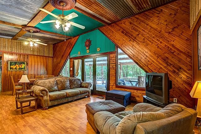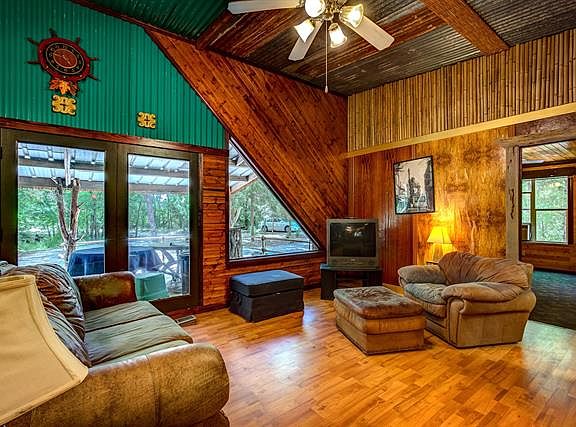 This is a unique rustic and cozy home nestled in the woods. This is an affordable and fun place to live or make it your weekend retreat. There is a RV hook-up by the storage building in front. Storage building has toilet, sink, water heater and washer and dryer. Kitchen features an extra sink in the island. Multi colored stained cabinets and rare wood veneered walls gives the kitchen and living area an interesting look that compliments the barn tin on the ceiling. Triangle windows with bamboo is Incorporated into the decor throughout this home. Large rooms with large master shower and tub are an uncommon asset. You won't find another home like this. Buyer and Buyer's agent to verify all information.