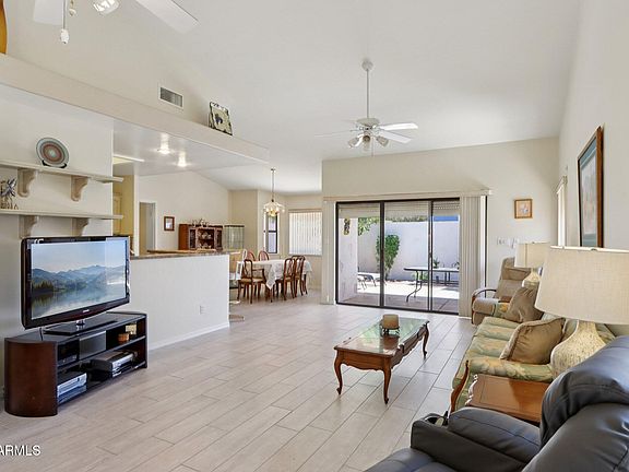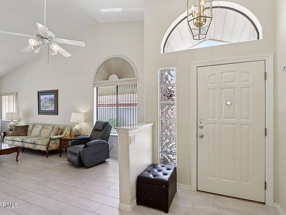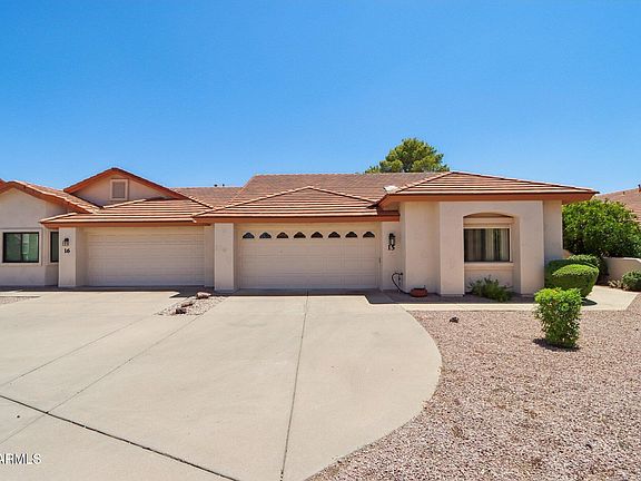 Welcome to the Premier 55+ community of ''Apache Wells''. Step inside to an open concept, split floor plan featuring 2 spacious primary bedrooms PLUS a versatile den, perfect for a home office, craft room, or guest space. Soaring vaulted ceilings elevate the airy feel, with new staggered neutral porcelain tile throughout. This beautifully maintained single level, end-unit townhome offers the perfect blend of comfort, privacy & plenty of natural light. Set on a cul-de-sac lot, this property enjoys enhanced privacy with a higher back fence line—ideal for peaceful indoor-outdoor living. The heart of the home features granite countertops, a breakfast bar & an inviting flow into the formal dining & family room. The main primary suite has an on-suite bath with dual sinks, a walk-in shower with a bench & spacious walk-in closet. Enjoy the added convenience of a dedicated laundry room with upper cabinets, bonus wall pantry & direct access to the 2-car extended garage with plenty of storage including built-in cabinets & separate work bench area. Security roll-down shades offer peace of mindideal for seasonal residents or those looking for a lock-and-leave lifestyle. Community offers a pool & spa.