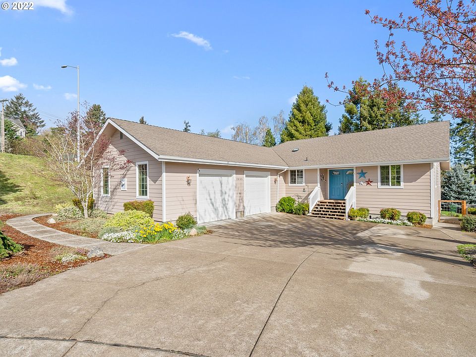 Beautiful home with lots of yard space, established Chicken coop and greenhouse! Large double doors invite you to vaulted ceilings, remodeled open floor plan, modern concrete counter tops with a lot of charm! Over sized 2 car garage has potential for 3 cars. Lots of storage space and work space! All interior doors are 32", easily accessible! Large laundry room with deep sink. Three decks create multiple lounging areas. Territorial views and possibly Mt. Hood!
