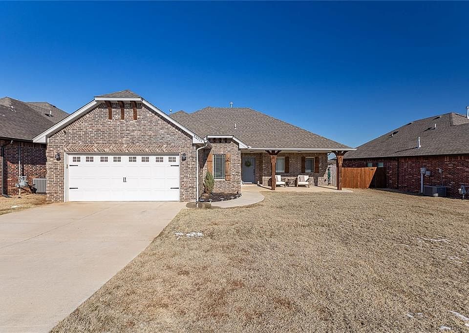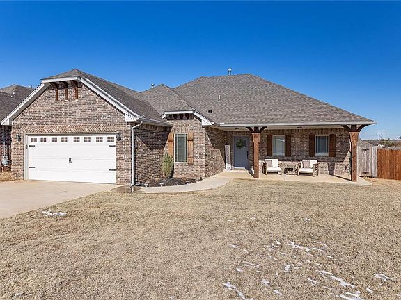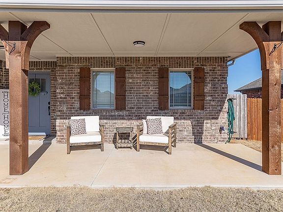 This well-cared-for home greets you with tall ceilings and an open floorplan plus nice upgrades like brick fireplace with wood mantle, jetted tub, granite, and wood look tile flooring throughout main living spaces, kitchen and primary suite. Beautiful wood beams run across vaulted ceiling in the kitchen featuring a big island, walk-in pantry, stainless steel appliances, and large farmhouse sink. Unwind in the very private primary suite with lovely vaulted ceilings, crown molding, and windows overlooking the backyard. Primary bath has double sinks, spa-like luxury shower, and large walk-in closet. Large laundry room with mud bench provides ample storage. Smart home features allow you to change the temperature, close garage door, and check camera feeds with Vivint app and smart hub security system. Take advantage of the oversized covered back patio and firepit area, which is perfect for entertaining. The home is just a short 10 minutes from Harrah Schools and brief drive to the turnpike.