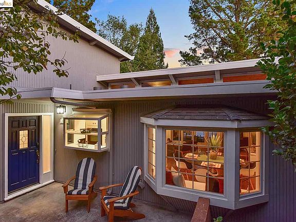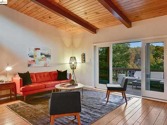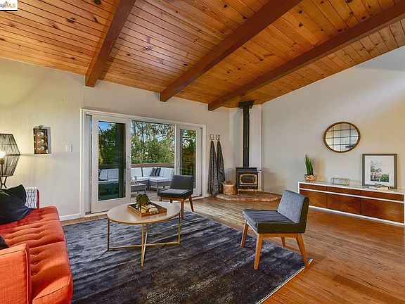 Set on a quiet street, this timeless mid-century modern home combines classic architecture with canyon views. Upon arriving you are greeted by a cozy patio, perfect for morning coffee. The large living room is light and airy, opening on to a large deck w/bay views. A wood stove, warm hardwood floors, exposed beams and updated retro lighting add to the mid-century magic. The kitchen adjoins the dining room perfect for family meals. A master bedroom w/ full bath as well as a second bedroom and full bath completes the main level. The lower level features a bedroom, full bath and large bonus room, again opening out on to a large deck which also provides access to the HUGE almost level yard. Street level has the convenience and security of a two-car garage. New paint, refinished floors and updated sliding doors, windows and lighting. Location! Just minutes from award-winning schools, Montclair Village restaurants and shops and the Transbay bus stop, highways 13/580/24, and Rockridge BART.