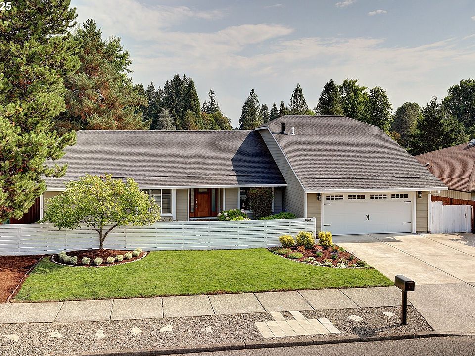Nearly fully renovated single-level home backing to the 4th hole of Rock Creek Country Club's 18-hole golf course. Almost every detail has been renewed, from the spacious and stylish kitchen with Bosch appliances, quartz countertops, custom cabinetry and oversized pantry. You'll love the adjoining light filled family room with walls of windows opening out to the gable roof deck. All with sweeping views out to the fairway and the fully fenced backyard with lower patio and convenient golf cart path and gate. Rest easy in the large primary bedroom suite with a new spa-like bathroom with dual sinks, walk-in shower and huge walk-in closet. At the front of the home, there is a grand entry that has been enlarged and extensive luxury vinyl plank flooring will lead you throughout this generous one level home. Both the formal dining room and formal living room (with its vaulted beam ceiling) are ideal for entertaining. The newly reconfigured laundry room has a utility sink, full size stackable washer and dryer and ample countertop space. Tucked above is a newly finished 4th bedroom or bonus room which now has a desirable full bathroom below (previously just a half bath). You will have more time to relax given these recent exterior updates, including new: roof, siding, paint, windows, doors, backyard drainage, front yard privacy screening and abundant landscaping. Newer Central AC, newer gas water heater, and more! The Rock Creek neighborhood offers a peaceful setting buffered by natural beauty - yet you are minutes to Hillsboro's Silicon Forest, Intel campuses, Nike and downtown.