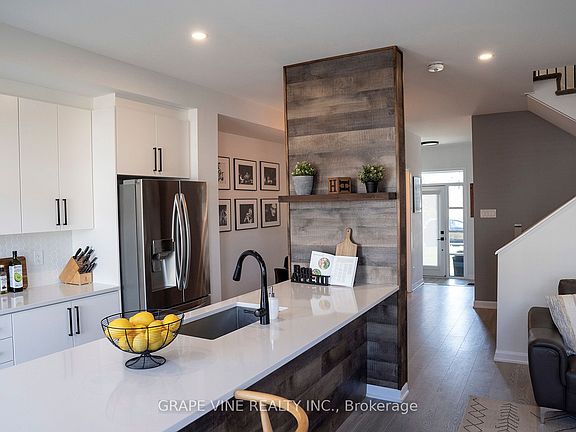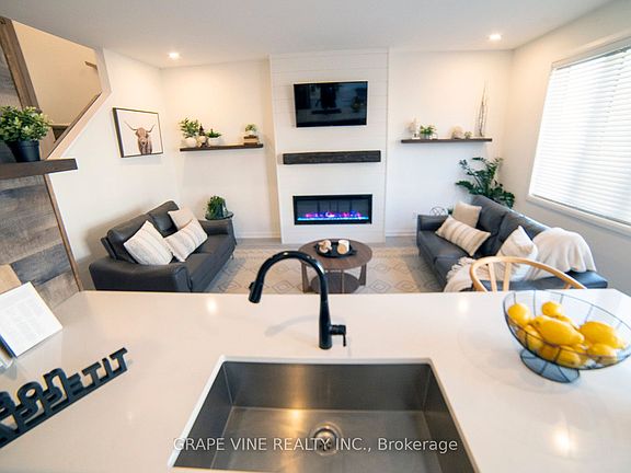 Welcome to this beautiful upgraded, move-in ready 3-bedroom contemporary townhome featuring $60K+ in premium upgrades. High-end laminate flooring throughout, including the finished basement. The open-concept kitchen boasts quartz counters, an oversized island, sleek backsplash & stainless steel appliances, perfect for entertaining. Bright living room with large windows & custom fireplace with rustic beam mantel and board-and-batten detail. Upstairs offers a spacious primary suite with walk-in closet & spa-like ensuite, plus two bright south-facing bedrooms and a full bath. Additional upgrades include quartz counters in all baths, pot lights, California shutters, custom roller blinds, upgraded hardware thruout + iron spindle staircase, customized lighting, eavestroughs, w/d and more. Steps to schools, transit, shopping, parks, & rec centre. A stylish, sun-filled home in a welcoming family community.
