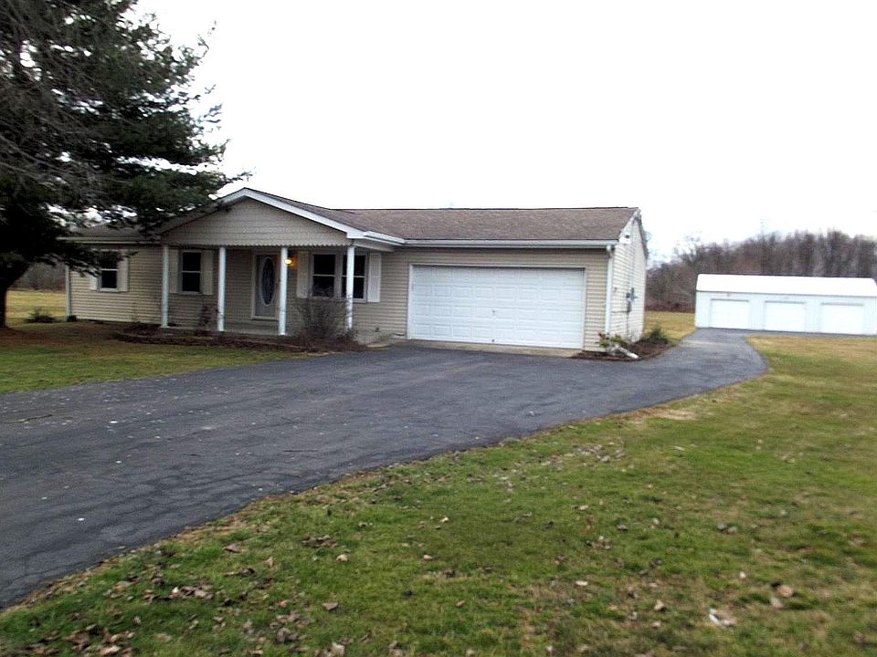 Three bedroom ranch on 2.086 acres; remodeled eat in Kitchen with stainless appliances; stove, dishwasher, refrigerator and microwave; Microwave & washer & Dryer included;2 car attached garage & 3 car detached 40 x 24; black top drive way; open framed front porch; stone laid rear deck.