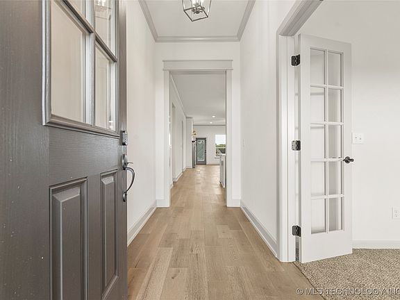 The Juniper at Frazier Meadows is located within the Bixby school district which is known for its place among the top 10 school districts in Oklahoma. Featuring the Au Naturale design package, this residence showcases multiple flex rooms, a spacious 3-car garage, and a thoughtfully crafted layout. Upon entry, a versatile flex room, adorned with glass French doors and abundant natural light, presents itself as an ideal space for a home office, or hobby area. The open kitchen and living area boast a gas fireplace, wood floors, a generous island with seating, and a convenient messy kitchen leading to an expansive pantry. The primary suite exemplifies convenience with its walk-in closet seamlessly connected to the laundry room, accompanied by a lavish bath featuring a 6-foot tub, a spacious walk-in shower with Schluter waterproofing, and separate vanities. Between the two additional bedrooms lies another flex room, perfect for a playroom, game area, or home gym. All bedrooms offer walk-in closets, and are accompanied by an extra storage linen closet in the hallway. Outside, a covered back porch off the living room, complete with an outdoor fireplace, provides an inviting retreat. Situated on a 0.2-acre lot facing southeast, additional amenities include a full sprinkler system, tankless water heater, healthy air filtration system, and smart system. The Frazier Meadows neighborhood enriches family living with its array of amenities, including a swimming pool, pickleball courts, playground, walking trails, and fishing pond.