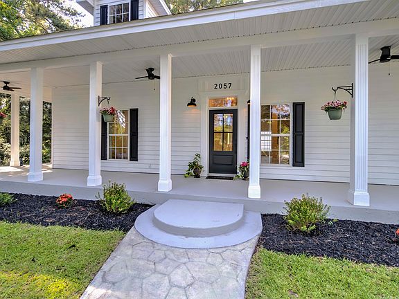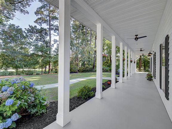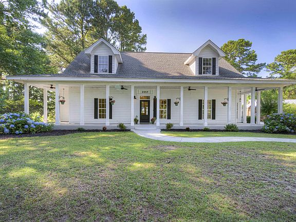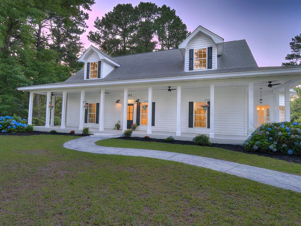 Rare Find! Recently remodeled from top to bottom, this low country style 3 bedroom, 2.5 bath home sits on 3.69 acres of cleared land that also features an approx. 1,415 heated sq ft. workshop - also completely remodeled - and a 400 sq. ft. storage shed/barn original to the property and believed to have been built around 1890 to 1900. Both home and workshop have been lovingly updated in the modern farmhouse style, and throughout both you will notice a blend of whites, black, natural wood and stone finishes that provide a tasteful and unified design. The spacious kitchen features a large breakfast nook with bay window, high-end Kitchen Aid appliances, a 36" THOR 6 burner electric cook top and oven, granite countertops, slow-close white cabinets, walk-in pantry and decorative tile backsplash. In addition to the show stopping kitchen, the primary ensuite spa-like bath is a stunner, as well. It not only features a walk-in closet with his and her built-ins, granite counter tops and new decor, but the 84 sq ft wet room is a complete statement of its own. Enjoy a soak in the free standing tub, or pick between standard, hand-held and rain head shower options. Do you enjoy music while you shower? No problem, it is also equipped with a bluetooth light, ventilation and speaker! Other upgrades in the home include: a primary bedroom suite on the first floor, a steel supported metal frame, 2 new HVAC units, new vinyl plank flooring on the first floor, new carpet on the second floor, all new paint throughout, electric fireplace in living room with custom driftwood mantel, and more. All bathrooms have updated granite countertops and are completely redesigned with the modern farmhouse theme. The workshop behind the home features a brand new AC unit, 2 car garage, office space, kitchenette, full bath, workroom, and approximately 300 sq ft of finished storage space on the second floor. The shed has been updated with 6 large solid glass pane windows, new subflooring, new cedar panels and trim and is wired for electricity so you can create your ultimate she/ he shed. In addition, water, sewer, plumbing and electricity have also been run to the back of the property making it extremely convenient to add a future pool house or guest house. Have you been looking for the perfect low country style home with large wrap around porch? Acres of land with mature cedar, oak, magnolia and Crepe Myrtles? With NO HOA? And, close access to International Dr., Hwy 501, and Hwy 22? If so, this is it! Don't wait. Schedule a showing today! Not in town? Request a link to the virtual tour or floor plans of both the workshop and home.