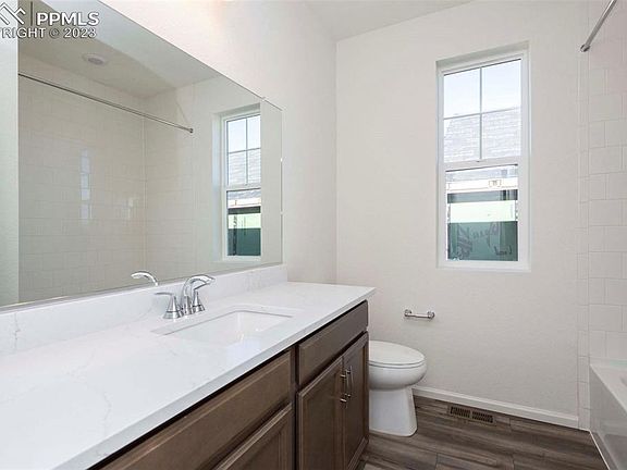 This home in Terrain Oak Valley is everything you will love about living in Castle Rock. This beautiful one story full unfinished basement ranch is surrounded by nature. Inside, discover an open floor plan with 9 ft ceilings and a traditional gas fireplace. The stylish kitchen boasts a large island, 42-in. Timberlake Latte upper cabinets, Calacatta Villa quartz counter tops and stainless steel General Electric appliances, including a gas range. On the main floor the primary suite showcases a walk-in closet, a connecting spacious primary bathroom with two linen closets, dual sink counter, and a sit down shower. For family and/or guests down the hall are two additional bedrooms and an office. Front landscaping is included. This home brings the best of both worlds together with nature and city, work and play, adventure and leisure. Nature is right out your door. You can enjoy walking and hiking trails that wind through the entire community. If you just want to sit and relax, within walking distance is the Swim Club/pool. The Swim Club (Clubhouse) is a warm gathering space, big screen TV, and fireplace. Terrain also offers the Dog Bone Park where you can unleash your 4-legged family members and let them run free. Also enjoy Wrangler Park with tennis courts, a picnic pavilion, playgrounds, and playfields. Centrally located on the plateau is Ravenwood Park with spectacular views, playground, and a long in-ground slide.