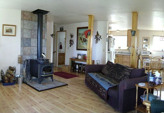 Cute Farm Home on 21.47 Acres! Totally solar home, saves lots of $$! 2bd w/den /2ba. 1457 Sq ft. 2 storage areas in mstr. bed, den. Good energy efficient house w/ back up generator. Lots of light thru lg. windows! Beautiful Hardwood flooring throughout. White appliances, custom Hickory cabinets, Lazy Suzans and linoleum flooring in kitchen. Wood Burning fireplace in Living room, w/ hardwood and slider to side deck. Yard fenced w/garden. 2 car detached garage w/ storage. Huge 4 stall barn w...