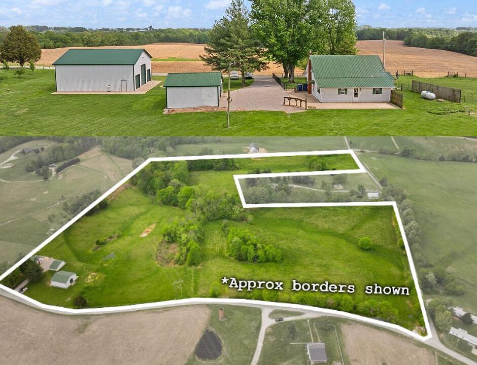 Discover this incredible property featuring 24.5 acres and a 3-bedroom, 2-bathroom farmhouse with a full unfinished basement and walkout access. Enjoy the serene views of rolling hills and distant mountains from the inviting covered front porch. The property includes two detached garages. The first garage is a massive 44 x 48 feet, offering over 2,100 square feet of space. It has both front and rear doors measuring 12 feet wide and 14 feet tall for easy drive-through access, as well as two additional doors measuring 10 x 9 feet. This garage is equipped with RV hook-ups, its own electricity, septic system, a full bathroom, a washer and dryer hookup, and a 12 x 23-foot second floor with LED lighting.