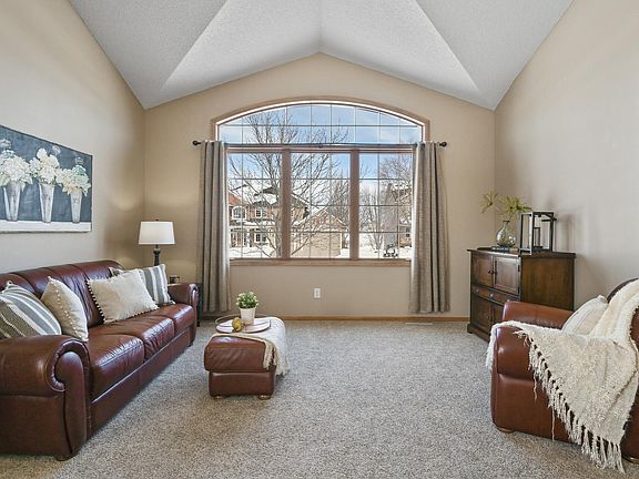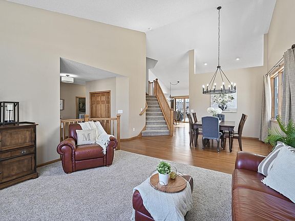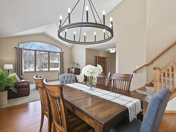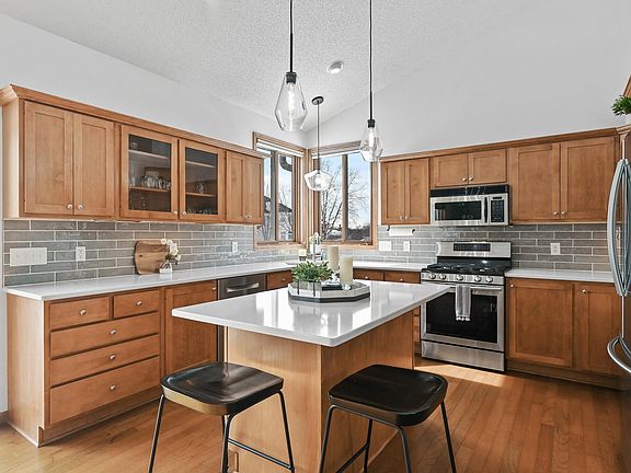 Impressive from the moment you enter this stunning home that warmly greets with gleaming wood floors, oversized windows & vaulted ceilings. Fall in love with the bright & open floor plan seamlessly connecting the dining room to the living room and leading to the newly modernized kitchen. Meticulous attention to detail is presented in the kitchen with quartz countertops, tile backsplash, updated lighting & stainless appliances. The spacious family room boasts a stone fireplace flanked with custom built-ins and flows effortlessly into the home office. The primary bedroom offers a large walk-in closet & private ensuite bath, complete with a jetted tub and separate tile shower. Allow your gatherings to overflow onto the large maintenance-free deck. You will appreciate the built-in storage area below the deck for your outdoor toys. This striking home is blocks from downtown Lakeville & conveniently close to restaurants, shopping & parks. Make your dream a reality and schedule a tour today.