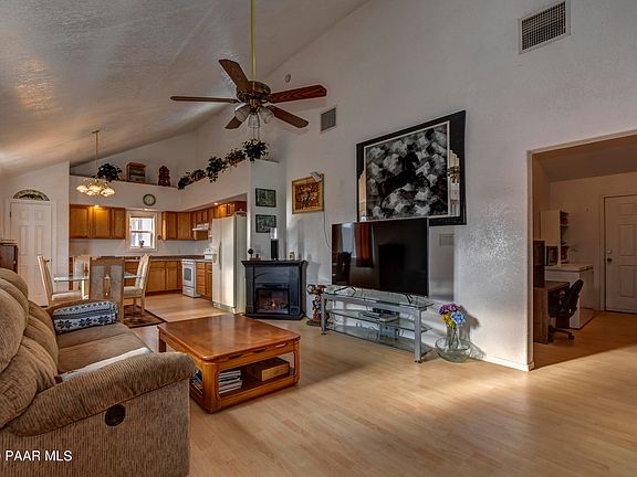 Cozy home on a 1/2 acre corner lot with room for all your toys! This single level spilt floor plan offers vaulted ceilings, tiled bathrooms, a large laundry room, and a alcove/den area perfect for a home office. Master bathroom features a walk-in shower, garden tub, and huge walk in closet! Open kitchen with large pantry. Sunscreens on all the windows. The huge backyard is an entertainers delight with forever views, pavers, gazebo,& a built in bar. Fenced dog run, storage shed, low maintenance landscaping and a detached 400 square foot full metal building that would make a great 1.5 car garage, man cave, or she shed. New roof and exterior paint in 2019. Don't miss this lovely well maintained home with convenient access to the Prescott area or Phoenix!