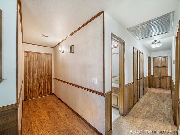 PRICE IMPROVEMENT. GREAT LOCATION This custom built home is 5 miles west of downtown Claremore on 5 acres. School bus route. Bring your HORSES or livestock. Backyard is chain link fenced and pasture is barbwire fenced with chicken coup. Large laundry room, 25x20 living area with accent wood wall and built in shelving. New carpet in living room and 2 bedrooms. Master bedroom, hallway, and entryway has hardwood flooring. Bathrooms have new luxury vinyl and are partially updated. Large covered deck as well as open deck. Also an additional detached 2 car garage with large workshop/game room with bathroom, mini kitchen. Unlimited possibilities