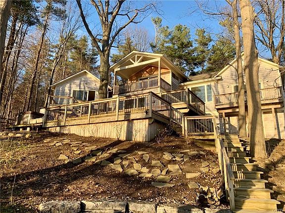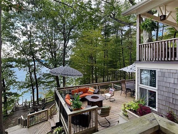 Wonderful year round lake home situated in a beautiful east side lake setting - private, wooded, minutes to village. Completely remodeled, this home boasts: a gourmet kitchen w/5 gas burner cooktop, double oven, double sink, large island with breakfast bar, microwave drawer, wet bar w/beverage drawer; 4 bedrooms & 3.5 bathrooms, the master suite w/cathedral ceilings; all bedrooms with sliders to a gorgeous deck overlooking the lake; new windows & doors; a split wall unit offering air conditioning; full generator. The detached 2+ garage has been insulated and has a full 2nd floor offering bonus space. The gorgeously developed waterfront boasts a 20' X 30' permanent dock, a 8' X 42' pier and shed. Seller has the ability to close immediately in order for someone to enjoy the spring & summer.