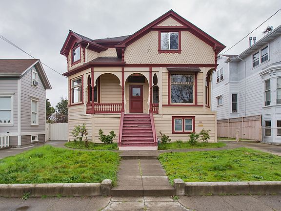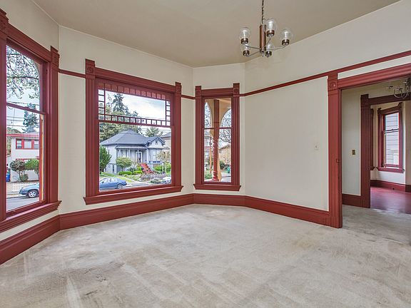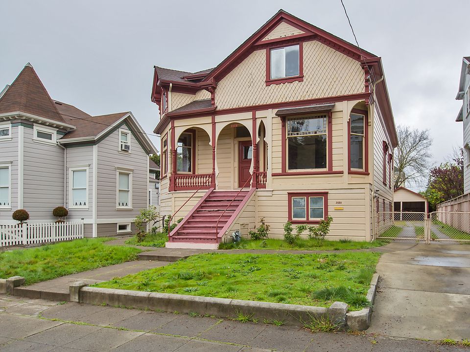 Built in 1900, this Bronze Coast Victorian features many untouched vintage details intact and ready to be showcased by the new owner. This is a wonderful opportunity to restore a beautiful piece of history. Walking up the front stairs you are greeted by a small sitting porch as well as an oversized front door with a glass window allowing you to peer in the foyer. Once inside, the foyer leads to the main parlor areas of the home. To the left is a perfect bedroom with a large window in an alcove with two side windows, just waiting for a large desk to be put in place facing out to the street. The closet in this room leads you through to the next bedroom, which you can also access from the hallway. This second bedroom was transformed into an additional kitchen area for the previous owners but is easily transformed back into a bedroom again. Beyond this bedroom is the guest bathroom in the hallway. This bathroom features a shower over bathtub and a vanity. A window in the bathroom allows for natural light to shine into the space. The master bedroom features a bathroom en suite with a shower over tub and vanity as well. The master bedroom ceiling has been dropped down and is waiting for the next owners to remove the dropped ceiling and restore it back to the high ceilings that were likely there originally. The space that once opened out to the backyard directly from the bedroom has been turned into a closet area that can easily be demolished back out for direct access to the yard from the master suite. The right side of the home begins with the opening from the foyer into the formal living room. The living room features high ceilings, picture rails, high baseboards, doug fir flooring under the carpeting, and large windows with divided lights at the top of the center picture window. The ceiling medallion is the centerpiece of the room and allows for a pendant light to hang down from it. A large encased opening with gorgeous pocket doors that have not been painted take you from the living room into the formal dining room. The focal point of the dining room is the fireplace with an untouched wood mantel and tiled hearth. All vintage details from the living room follow through into the dining room creating a wonderful flow into these spaces. Beyond the dining room is the kitchen. From a renovation standpoint, one could open up the wall between the dining room and the kitchen for an open floorplan concept that would carry all the way out to views of the backyard. For now, the kitchen consists of two areas. One large, open space with wainscoted walls and a built in pantry space. Beneath the linoleum flooring is very likely doug fir. Beyond this initial room is a small room that overlooks the backyard and features the stove and kitchen sink area. From the kitchen and master bedroom, you have access to the backyard as well as the staircase leading to the upper level of the home. Upstairs, you are greeted by a large family room area with a built in cabinet with glass doors and display shelving as well as drawers. There are also two fairly large closets within this space, perfect for storing arts and crafts or board games for playing upstairs. There is wonderful alcove within the room with a clerestory window above, perfect for a study space or office. From the family room, there is access to two bedrooms and a full bathroom. The bathroom features a shower over tub and a vanity. The two bedrooms are cozy with the ceiling angles adding to the architecture of the space. Windows from each of these bedrooms peer out over the neighboring homes from this tall Victorian.
