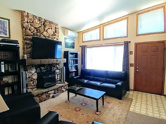 Vaulted ceiling in this contemporary home. Living room with wood stove insert in fireplace, large pantry off kitchen, separate eat in dining room, Large yard with dog kennel 2 sheds and extensive patio area, yard is completely fenced with gated driveway.