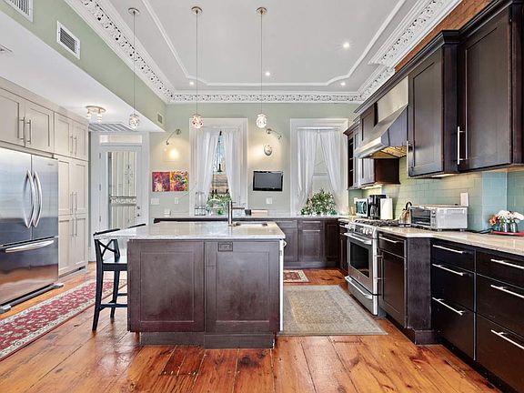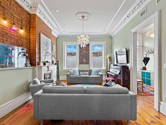 Downtown Jersey City 1880 historic brownstone with parking! 20 ft wide and tastefully renovated with a mix of classic original features such as crown mouldings, wide plank hardwood flooring, and exposed brick walls and chimneys, alongside modern amenities like central air, washer dryer, and modern kitchen and bathrooms. Enter the home into the parlor level and you'll find the living room which flows into the kitchen in an open floor plan. High ceilings with decorative trim, chandeliers as well as recessed lighting, lots of exposed brick, and room for a dining table. Half bathroom on this level with yet more exposed brick. The chef's kitchen has an abundance of cabinet space and long granite countertops, along with an island in the middle. Upstairs each floor provides two large bedrooms, an additional bedroom/office/den, and a full bathroom, bringing us to six bedrooms and 2.5 bathrooms. The large bedrooms have spacious walk-through closets between them. One bathroom as a bathtub and the other has a custom made glass enclosed steam shower. The rear windows overlook the private backyard. There is a carriage house in the back of the yard which has electricity and makes a great additional space for a variety of uses.