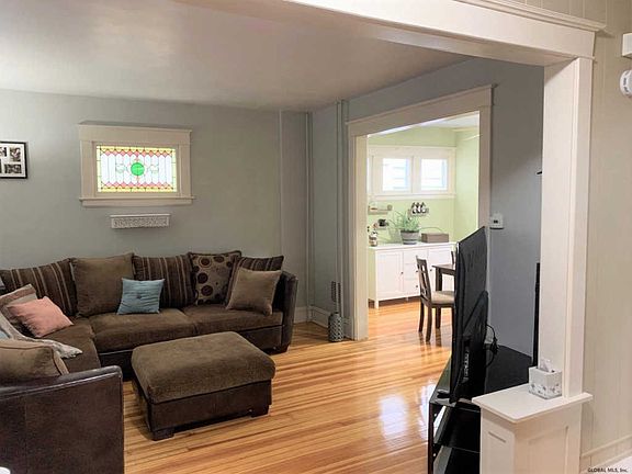 Welcome to this stylish move-in ready 3 bedroom, 1.5 bath bungalow in Watervliet City schools! Freshly painted exterior, gorgeous newer pressure-treated deck with fully fenced backyard, paver firepit AND one off-street parking space (concrete slab) -- WOW! Beautifully maintained hardwood floors throughout! Kitchen features an updated sleek aesthetic with modern white cabinets, tiled flooring, stainless appliances and durable, sparkling backsplash. Wall oven is flanked by faux painted brick--enhancing its textural appeal. Custom chair rail, crown molding and original distressed wood doors adds a rustic flair. Newer vinyl windows, water heater (2017), seamless gutters, water line to house, baths and kitchen. Full basement with laundry and storage space. Minutes to I-787, Route 378, Albany and the Adirondack Northway along with plenty of retail and grocery shopping, restaurants, medical and fitness facilities -- you name it!