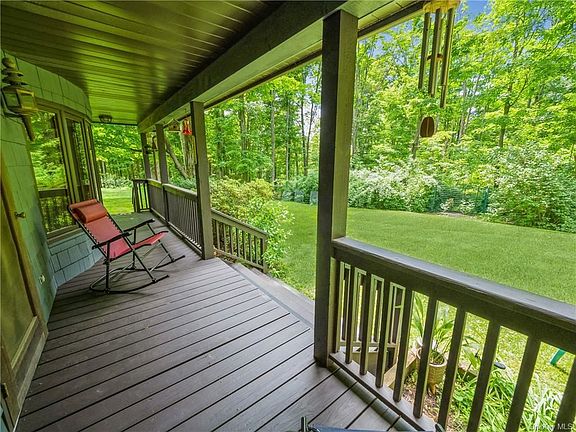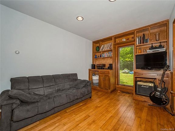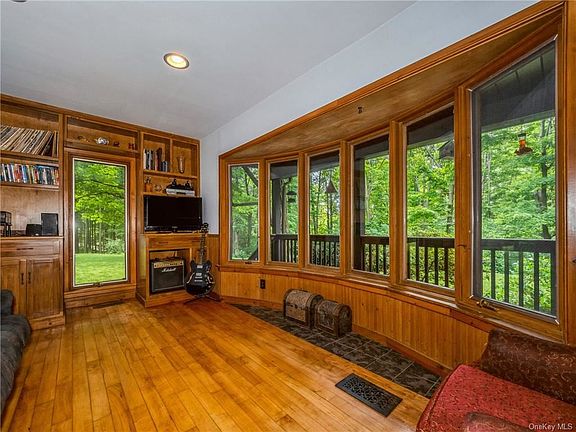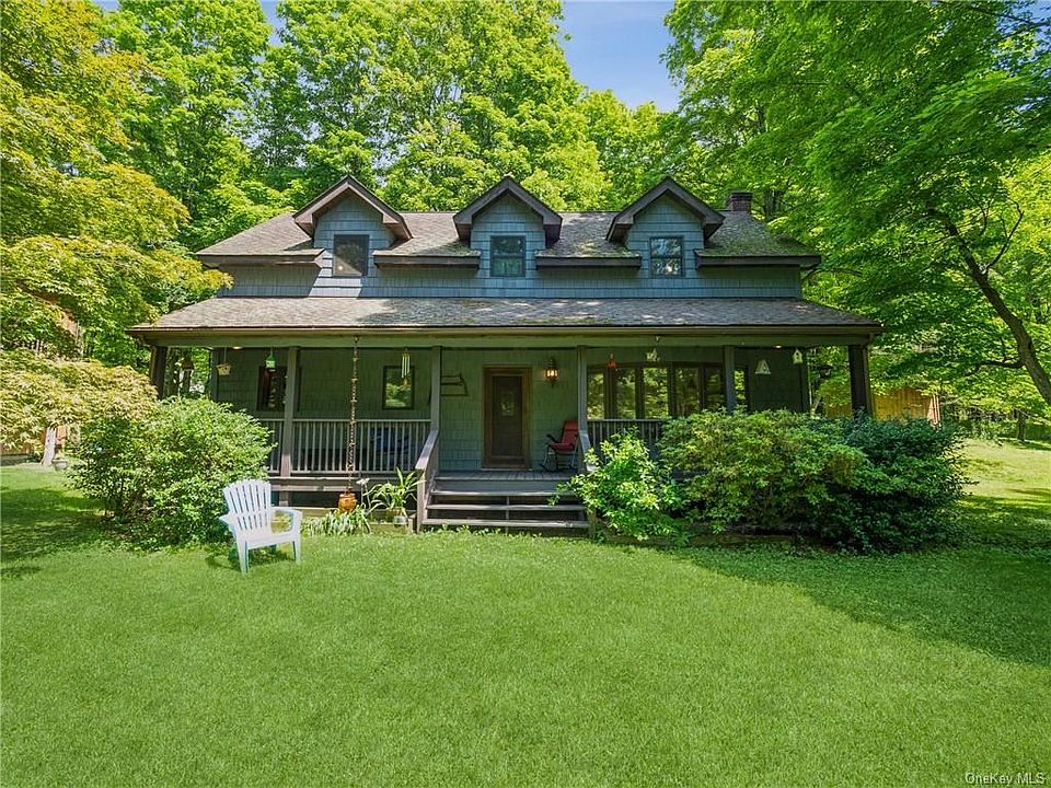 Tucked privately on 5.17 acres, this darling Cape Cod has a welcoming full front porch and cedar shakes exterior. Built in 1961, the second floor was added in the 90's, this cozy home has a spacious LR with HW floors, a bow picture window and built-in bookcase. There's a 1st floor bdrm which looks out toward the wooded property and newly updated full bath. The EIK has cherry cabinets, tiled floor and backsplash and French doors leading to private, wooded backyd. The 2nd floor has 2 large bdrms with cathedral ceilings, skylights, solid hemlock beams and bamboo flooring, full bath and walk-in storage closet. The windows on the 2nd floor were replaced in 2020/skylights in 2021. This property also boasts a det. 2 car garage with ample storage for cars, equipment/tools, etc. Above the garage you'll find finished storage and a bath. This adorable home is less than 10 minutes to Taconic Pkwy, Millbrook, Tymor Park, James Baird State Park, The Links Golf Club at Union Vale, shopping & more.
