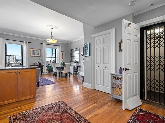 Water side Beacon Street with Charles River and lagoon views of the Esplanade. The former home of the Spanish Consulate in Boston, this direct elevator entry home features 2 beds, 1 full, 1 half bath, 3 walk-in closets, 10-ft ceilings, central air, hardwood floors, abundant natural light on the sunny side of the street. This floor through unit features tremendous views of Back Bay to the south and the Charles river to the north and feels like more like 1,000 sq.ft+. Located in the heart of prime Back Bay between Clarendon and Dartmouth Streets on the 4th floor in a unique building, featuring beautiful carved wood front entry doors and copper clad bay window. The perfect place in the city, close to the foot bridge to access the Esplanade, just 3 blocks to the Public Garden, and DIRECT ACCESS PARKING via elevator out the back of the building. Space lives larger than public record square footage, and has 2 decorative fireplaces and mantles in bedroom and living room with hardwood floors